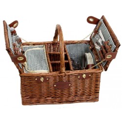 Les dimensions de ce panier pique-nique sont 46 x 33 x 24 cm. Dans un compartiment, vous avez la vaisselle (4 verres + 4 assiettes + 4 couverts). Tout est bien fixé pour voyager paisiblement et en sécurité.