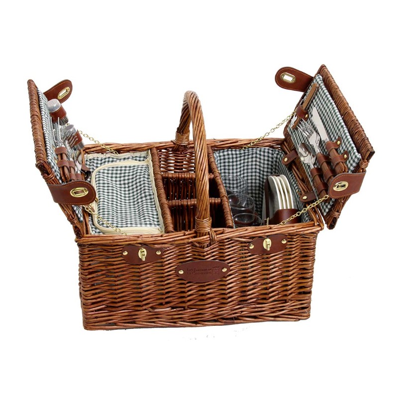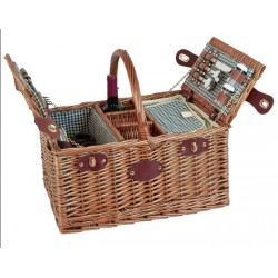 Ce panier pique nique aux couleurs vichy vert a été conçu pour 4 personnes. Il est très pratique car il a un compartiment isotherme pour garder au frais quelques aliments et 3 emplacements pour y mettre des bouteilles (vin ou eau). Le 3e compartiment est fait pour y mettre des assiettes, couverts.